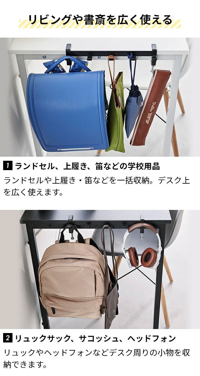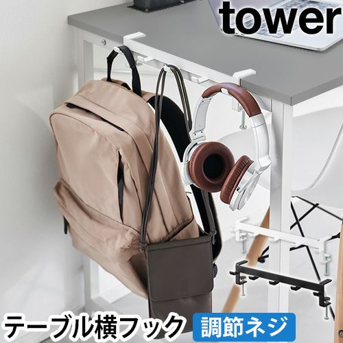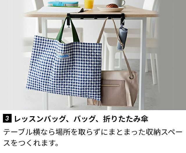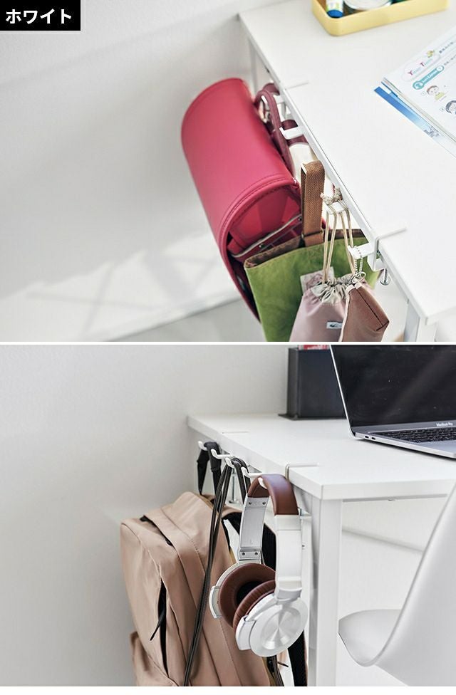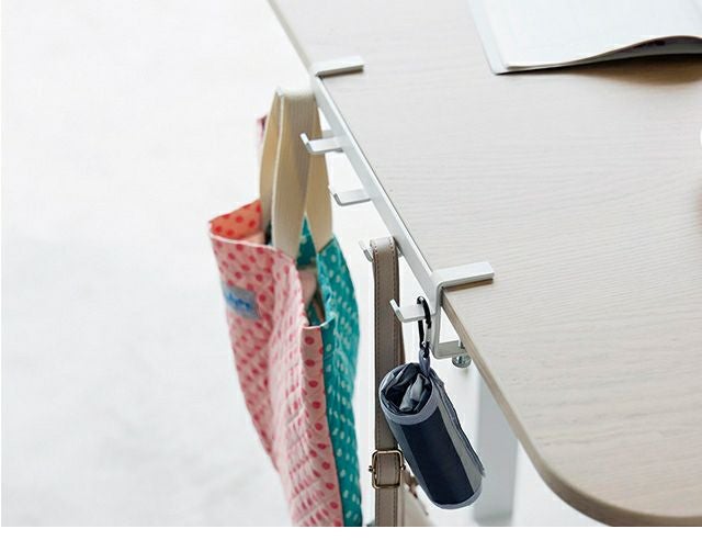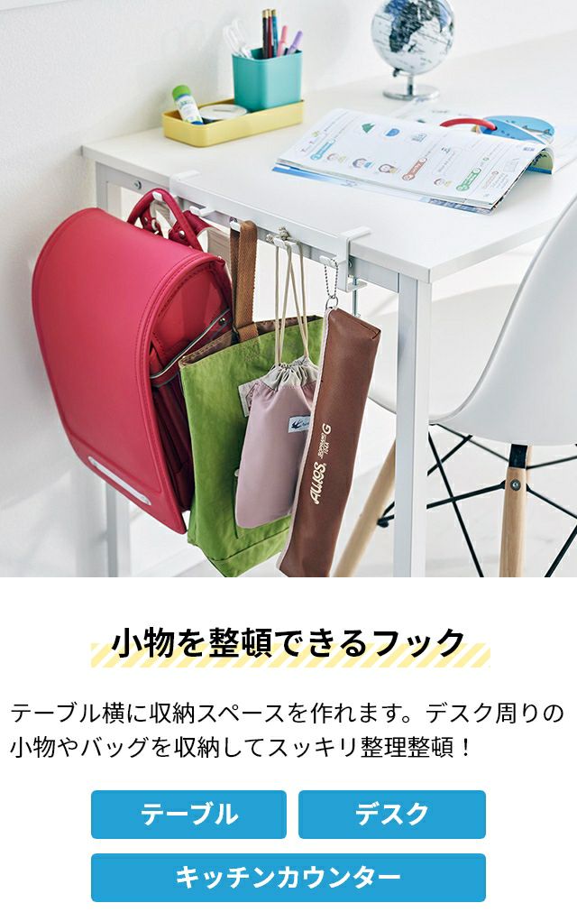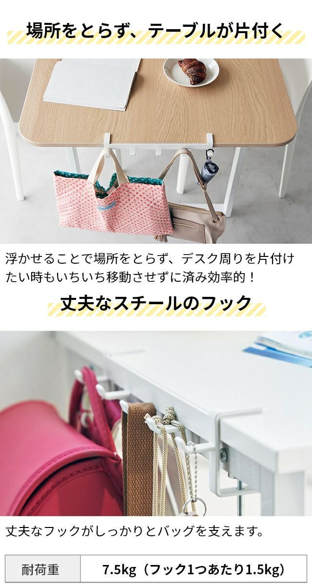 調節ネジで簡単に取付け可能!テーブル横の隙間に収納スペースを作れる5連フックです。カバン掛けにしたり、学校用品やレッスンバッグをスマートにまとめて収納します。 山崎実業 テーブル横フック タワー 1576 1577 ラック ハンガー 引っ掛け 吊り下げ スリム 跡がつかない 穴開けない おしゃれ コンパクト 荷物掛け スチール カバン掛け こども tower 吊り下げ収納 浮かせる収納 yamazaki タワーシリーズ