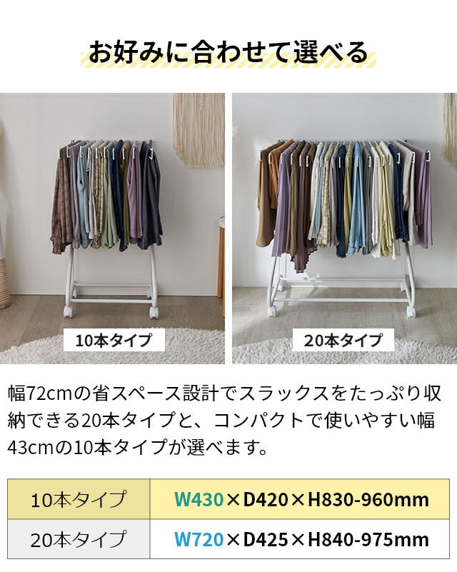 他の画像を見る 省スペースで充実の収納力!スラックスなどのボトムをたっぷり収納。キャスター付きだから移動もラクラク。見つけやすくシワもつきにい、まさに理想的なズボン収納です。 ユクスス ズボンハンガー 生活に馴染む スラックスハンガー キャスター付き 10本タイプ パンツラック ズボン掛け ラック 省スペース スリム クローゼット コンパクト 大容量 10本掛け おすすめ おしゃれ 収納 かけやすい 高さ調整 yucuss 当店特別価格 ¥ 3,400 税込 詳細を見る お気に入りに登録する