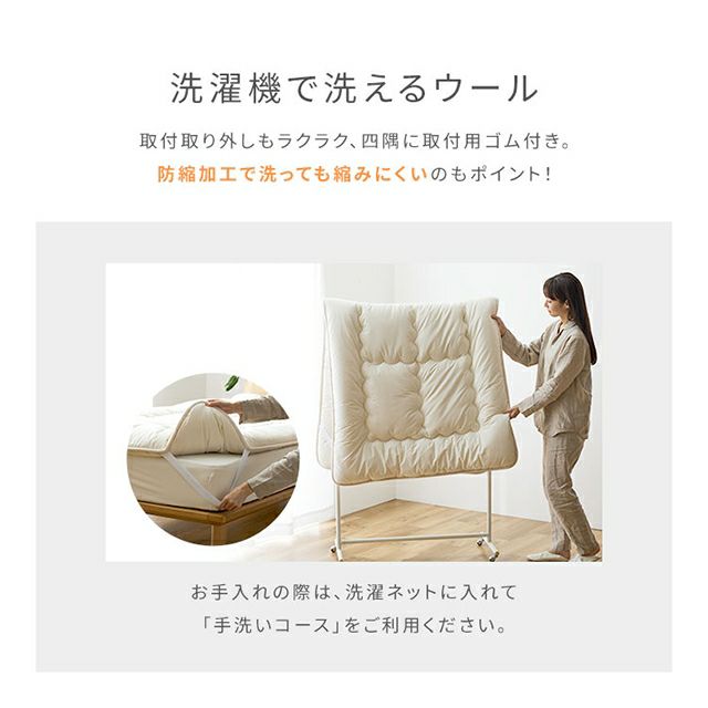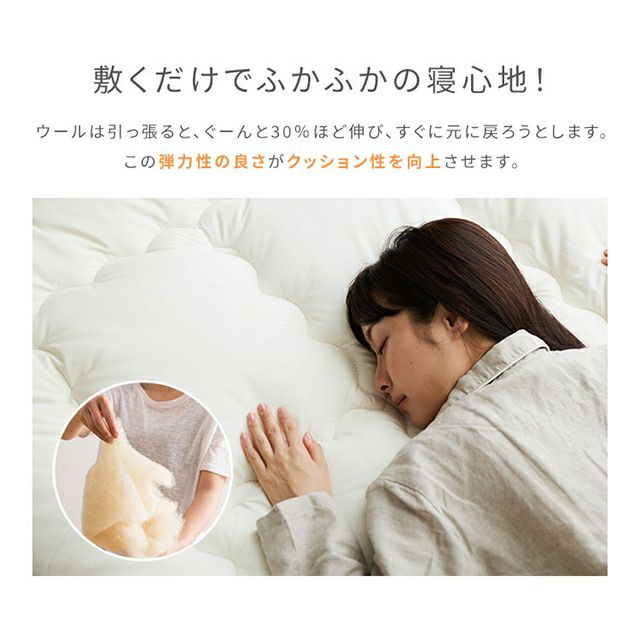 他の画像を見る 冬は暖かく夏は涼しい、洗えるウール100%のベッドパッドです。高いクッション性で寝心地アップ。ご家庭の洗濯機で丸洗いOK、マットレスを汚れから守ります。 ナイズデイ ベッドパッド Sleep Niceday フランス産ウォッシャブルウール100%使用した 増量プレミアムベッドパッド 日本製・消臭・吸湿 S 敷き布団パッド マットプロテクター シングル 羊毛100% 保温 洗える オールシーズン 厚手 Niceday 当店特別価格 ¥ 14,800 税込 詳細を見る お気に入りに登録する