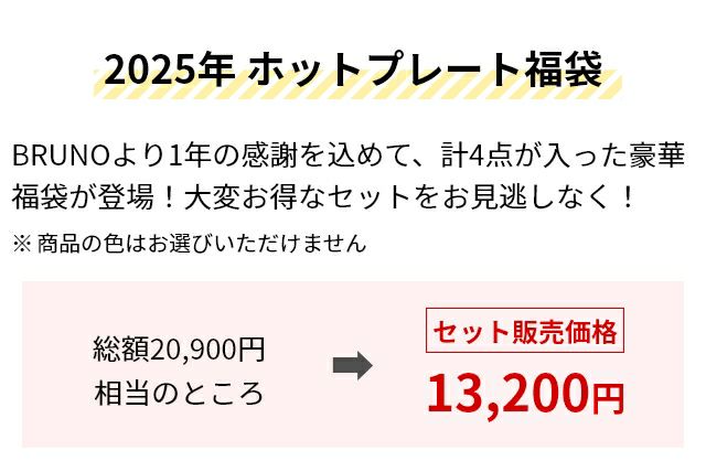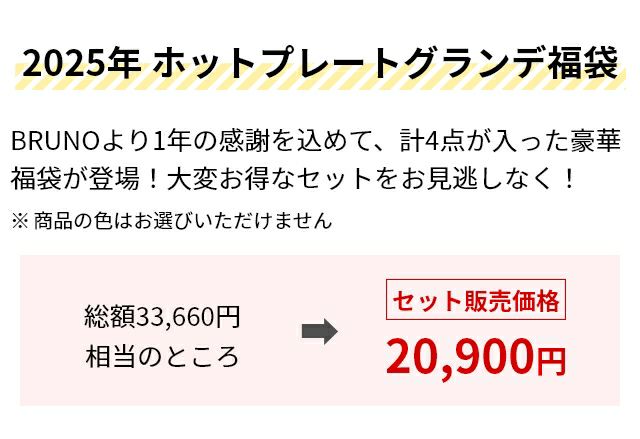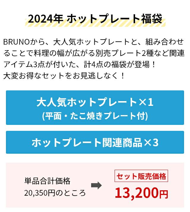 他の画像を見る BRUNOより大人気ホットプレートと関連商品2点、雑貨1点のお得な福袋が登場!ホットプレートは家族で楽しめる大きめサイズで、平面プレート・たこ焼きプレートを標準装備! ブルーノ 2024年 グランデ福袋 ホットプレート セット 家電 おしゃれ キッチン 大型 たこ焼き 温度調節 家族 5人 4人 四角 大きい パーティー 子供 洗いやすい かわいい 平面プレート 卓上 焼肉 アヒージョ 餃子 パエリア パンケーキ BRUNO 当店特別価格 ¥ 20,900 税込 在庫切れ 詳細を見る お気に入りに登録する