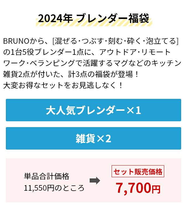 他の画像を見る BRUNOより、大人気ブレンダーと雑貨2点が付いた大変お得な福袋が登場!1台5役の万能ブレンダーと、アウトドアなどで活躍するマグなどの、キッチン雑貨を含む豪華セット! ブルーノ 2024年 ブレンダー福袋 ハンドミキサー フードプロセッサー ホイッパー 泡立て器 マグ 離乳食 電動 メレンゲ 北欧 洗いやすい 生クリーム おしゃれ お手入れ簡単 氷 砕ける コンパクト 肉 ミンチ アタッチメント みじん切り かき氷 BRUNO 当店特別価格 ¥ 7,700 税込 在庫切れ 詳細を見る お気に入りに登録する