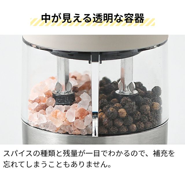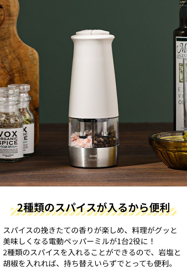 他の画像を見る スパイスの挽きたての香りが楽しめ、料理がグッと美味しくなる電動ペッパーミルが1台2役に!2種類のスパイスを入れることができるので、持ち替えいらずでとっても便利。 ブルーノ 【豪華特典付き】 ペッパーミル ダブルオートスパイスミル BHK298 電動ミル ソルトミル ソルト&ペッパー 電動 錆びない おしゃれ かわいい 片手 粗さ調節 あらびき 岩塩 粗塩 胡椒 2種類 自動 おすすめ ワンハンド ワンプッシュ BRUNO 当店特別価格 ¥ 3,850 税込 在庫切れ 詳細を見る お気に入りに登録する
