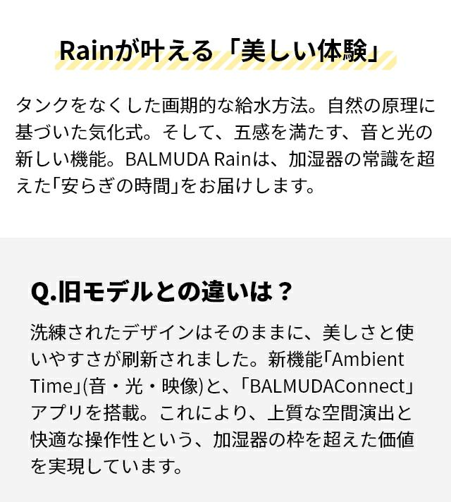 他の画像を見る タンクをなくした画期的な給水方法。自然の原理に基づいた気化式。そして、五感を満たす、音と光の新しい機能。加湿器の常識を超えた「安らぎの時間」をお届けします。 【専用収納袋の特典付】 バルミューダ 加湿器 レイン BALMUDA Rain AHM01JP-WH 気化式加湿器 Wi-Fi対応 おしゃれ 省エネ お手入れ簡単 静か リビング 寝室 オフィス デザイン家電 インテリア 当店特別価格 ¥ 69,300 税込 詳細を見る お気に入りに登録する