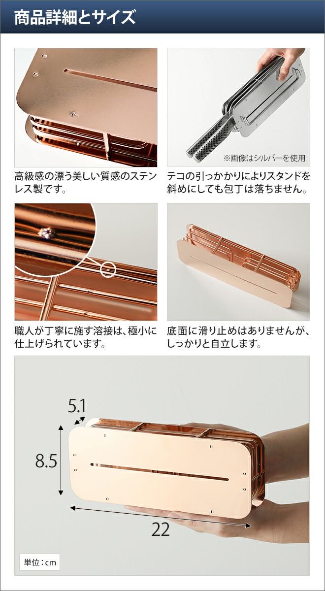 他の画像を見る hanautaのディッシュドレイナーに装着して使える包丁スタンド。単体でもスタイリッシュに使えます。 ハナウタ 包丁スタンド ローズゴールド 単品 当店特別価格 ¥ 20,020 税込 詳細を見る お気に入りに登録する
