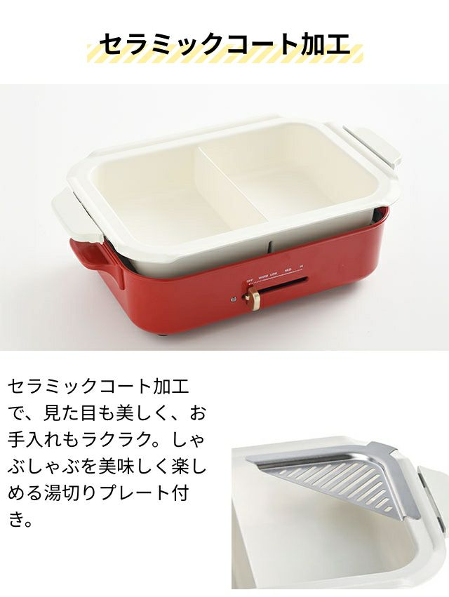 他の画像を見る 小さいけれど、侮る無かれ。最大250℃のハイパワー調理が可能! ブルーノ コンパクトホットプレート+仕切り鍋2点セット BOE021 二色鍋 たこ焼き器 二食鍋 焼肉 しゃぶしゃぶ 餃子 火鍋 2~3人用 小型 一人暮らし すき焼き ビビンバ グリル 電気 温度 おしゃれ レシピ パーティー BRUNO 当店特別価格 ¥ 15,840 税込 在庫切れ 詳細を見る お気に入りに登録する