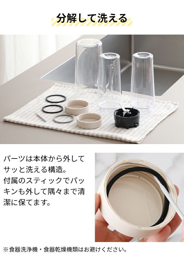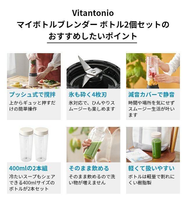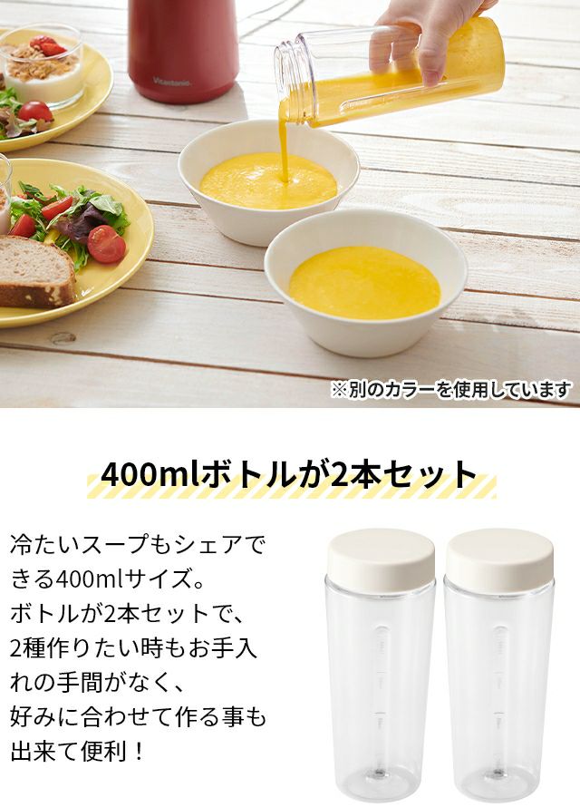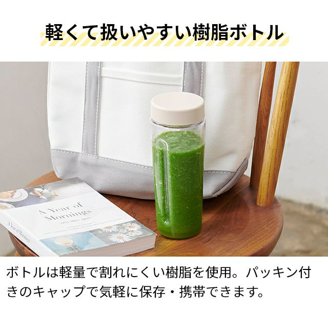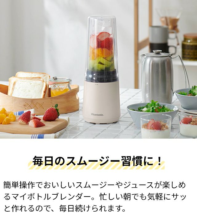 他の画像を見る フレッシュスムージーが簡単&滑らかに作れるミキサー。スリムでコンパクトなのに氷も砕けるパワフルさ。減音カバー付きで、夫婦で持ち運びやすいボトル2本セットです。 ビタントニオ ミキサー スムージー マイボトルブレンダー VBL-60 ボトル2個セット ジューサー 氷も砕ける 持ち運び 洗いやすい ジュース そのまま飲める 冷凍フルーツ 400ml お手入れ 簡単 軽い コンパクト 小型 氷対応 静音 野菜 Vitantonio 当店特別価格 ¥ 6,600 税込 詳細を見る お気に入りに登録する