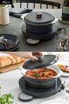 「recolte 卓上IHクッキンググリドル」の「卓上IHヒーター」と同色の「recolte IH対応鍋」。熱伝導に優れたアルミダイキャストを使用し、内側はセラミックコーティング加工により焦げがつきにくお手入れも簡単。IHヒーターだけでなく直火にも対応します。