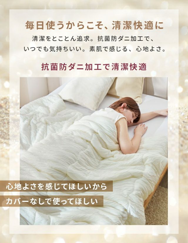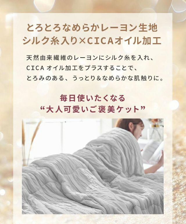 他の画像を見る 天然由来繊維のレーヨンにシルク糸を織り込み、CICAオイル加工をプラスした、とろみのある、うっとり&なめらかな肌触りの掛け布団です。調温わたでオールシーズン快適。 モフア 肌掛布団 シルク糸をいれた うっとりなめらか くしゅふわケット セミダブル 掛け布団 キルトケット 肌布団 夏布団 レーヨンケット 肌ふとん ふわふわ くしゅくしゅ 温度調節 オールシーズン 洗える かわいい お昼寝 軽量 春 夏 秋 冬 mofua 当店特別価格 ¥ 8,980 税込 詳細を見る お気に入りに登録する