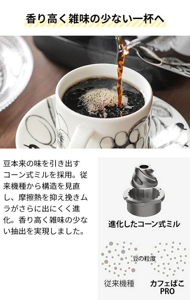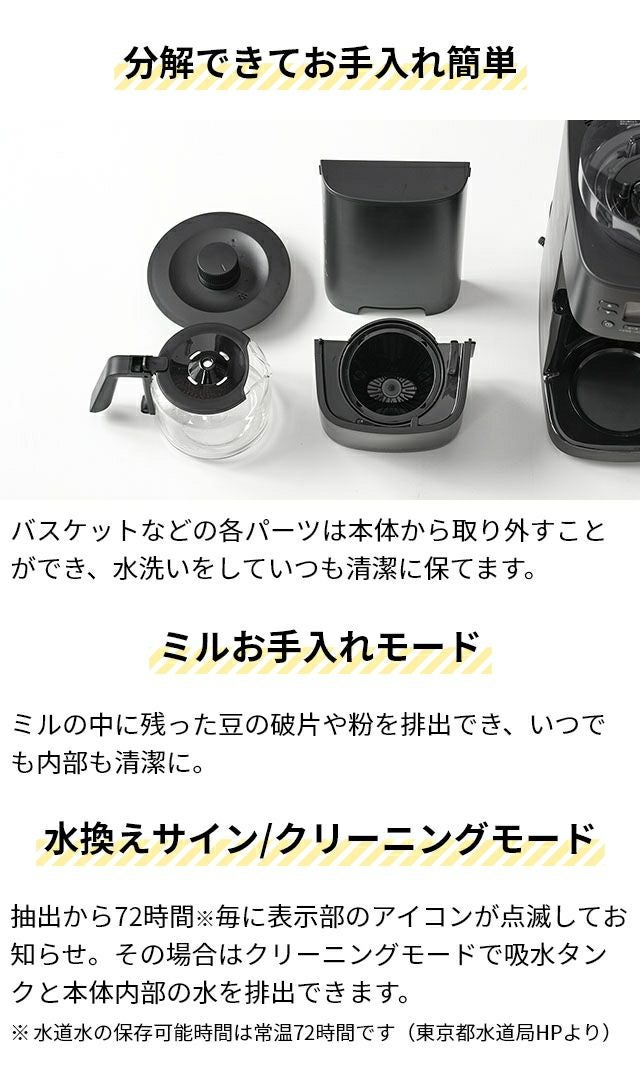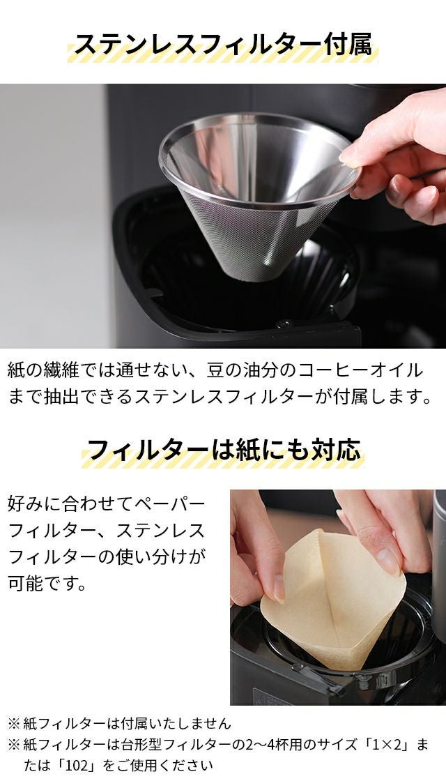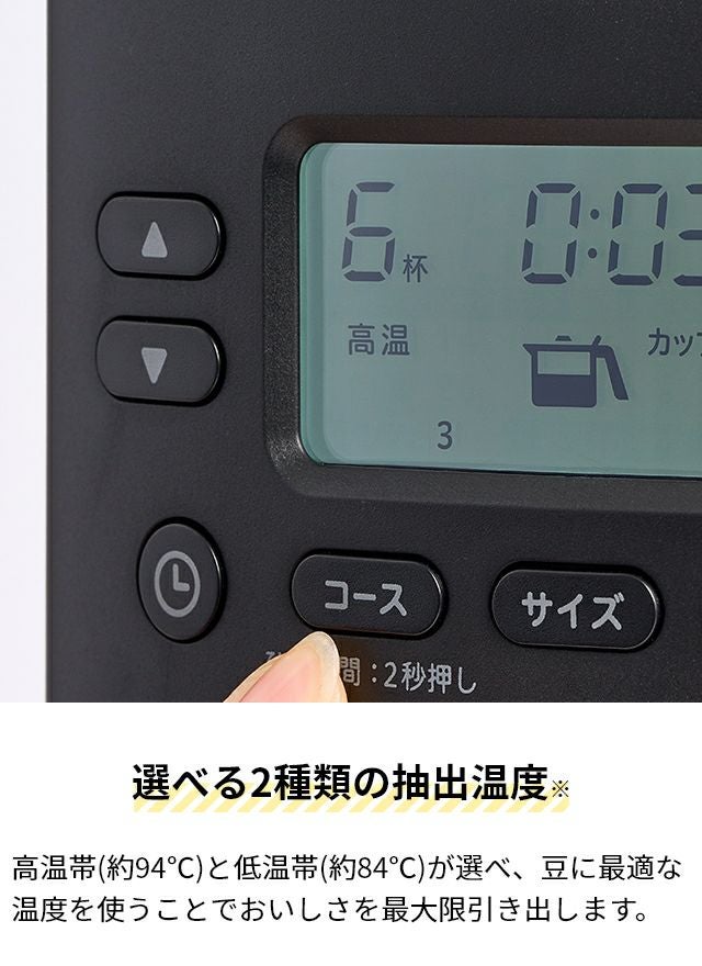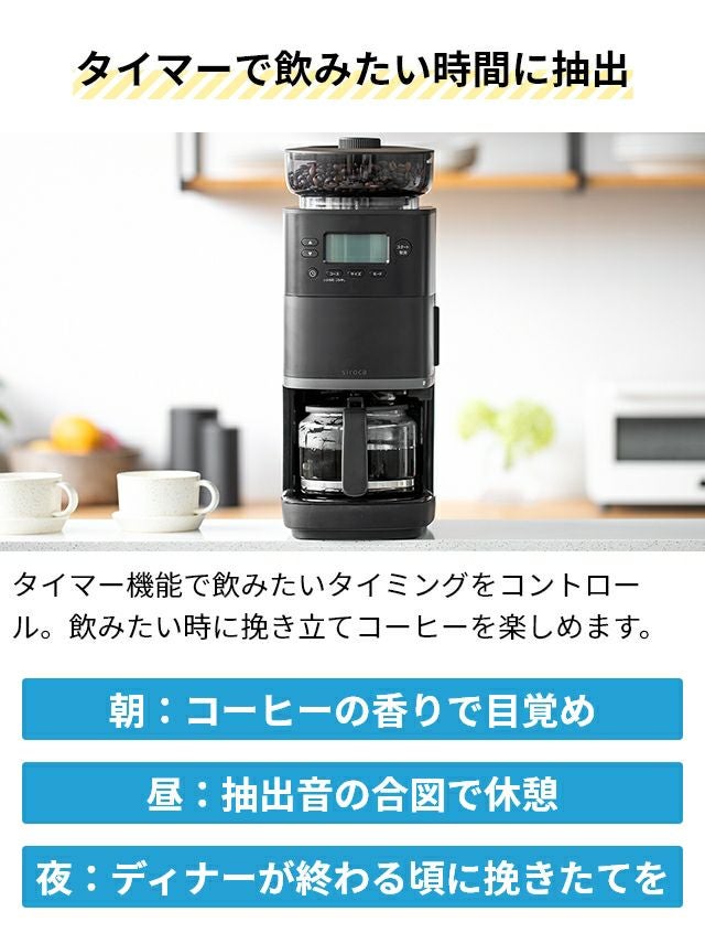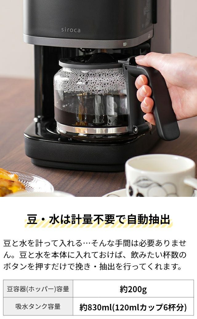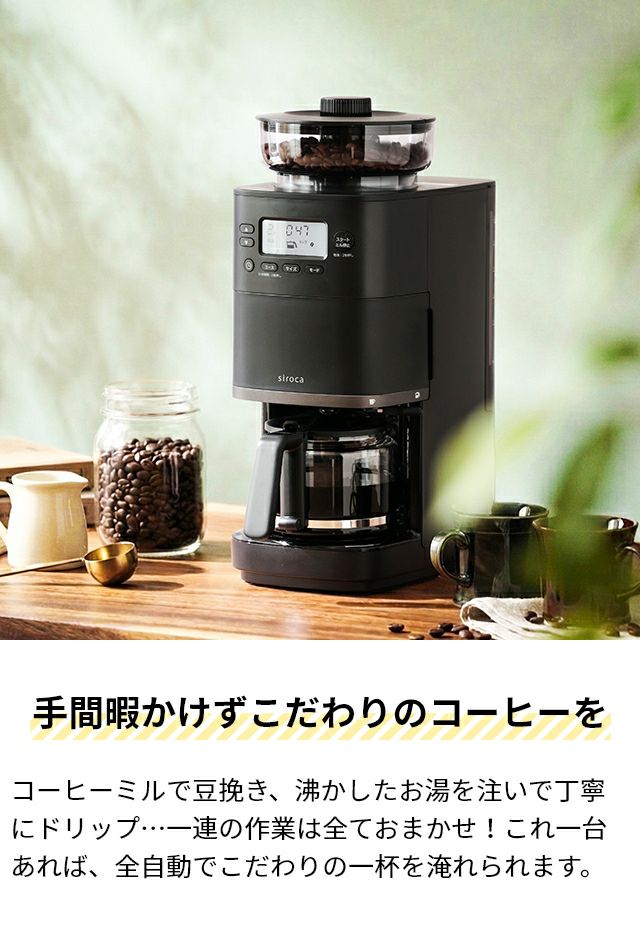 他の画像を見る 高精度のコーン式ミルを採用し、豆の挽きムラを抑え、雑味の少ないコーヒーを淹れられます。豆・水の計量不要、タイマーつきで忙しい朝も楽! シロカ 【選べる2大特典】 全自動コーヒーメーカー カフェばこPRO CM-6C271 ミル付き 全自動 タイマー機能 おしゃれ 保温機能付き ドリップポッド アイス ステンレスサーバー 着脱給水タンク お手入れ簡単 ガラス容器 直接マグカップ 6杯 siroca 当店特別価格 ¥ 29,700 税込 詳細を見る お気に入りに登録する