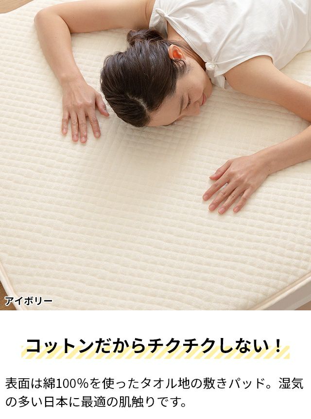 他の画像を見る 綿100%使用、ふわふわタオル地が心地よい敷きパッドのワイドキングサイズ。風通しが良いパイルと寝汗を吸収する綿のおかげでオールシーズン快適です! ナイスデイ 敷パッド さらっと快適 天然素材(綿100%)タオルの敷きパッド(中綿レーヨン入り) WK ワイドキング ベッドパッド 敷き布団 タオル地 敷布団 綿100% パイル オールシーズン 春夏 洗える コットン 子供 肌触り ゴムバンド付き Niceday 当店特別価格 ¥ 5,480 税込 詳細を見る お気に入りに登録する