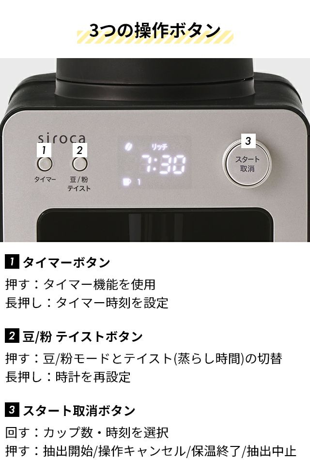 他の画像を見る コーヒー豆をミルで挽く、お湯を沸かす、ドリップして淹れる、すべてを自動で行ってくれるコーヒーメーカー。おうちでも手軽に挽きたての美味しいコーヒーが楽しめます。 シロカ 【選べる2大特典】 全自動コーヒーメーカー カフェばこ SC-A372 ミル付き 全自動 タイマー機能 おしゃれ 保温機能付き ドリップポッド ホット アイス ステンレスサーバー 着脱給水タンク お手入れ簡単 4杯分 コンパクト 小さめ siroca 当店特別価格 ¥ 19,800 税込 詳細を見る お気に入りに登録する