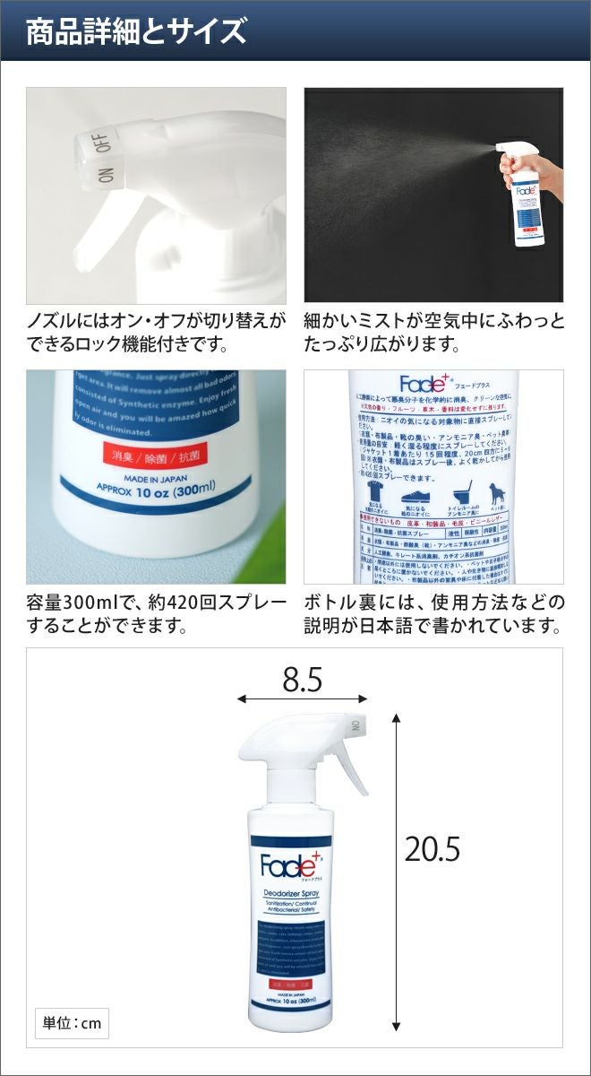 他の画像を見る 消臭スプレー/消臭剤/除菌スプレー/フェードプラス/Fade+/300ml/除菌/抗菌/無香/無色/無臭/ノンアルコール/99%/衣類/部屋用/トイレ/靴/タバコ/ペット/ソファ/カーテン/ファブリック/車 フェードプラス 消臭スプレー 300ml 当店特別価格 ¥ 2,530 税込 在庫切れ 詳細を見る お気に入りに登録する