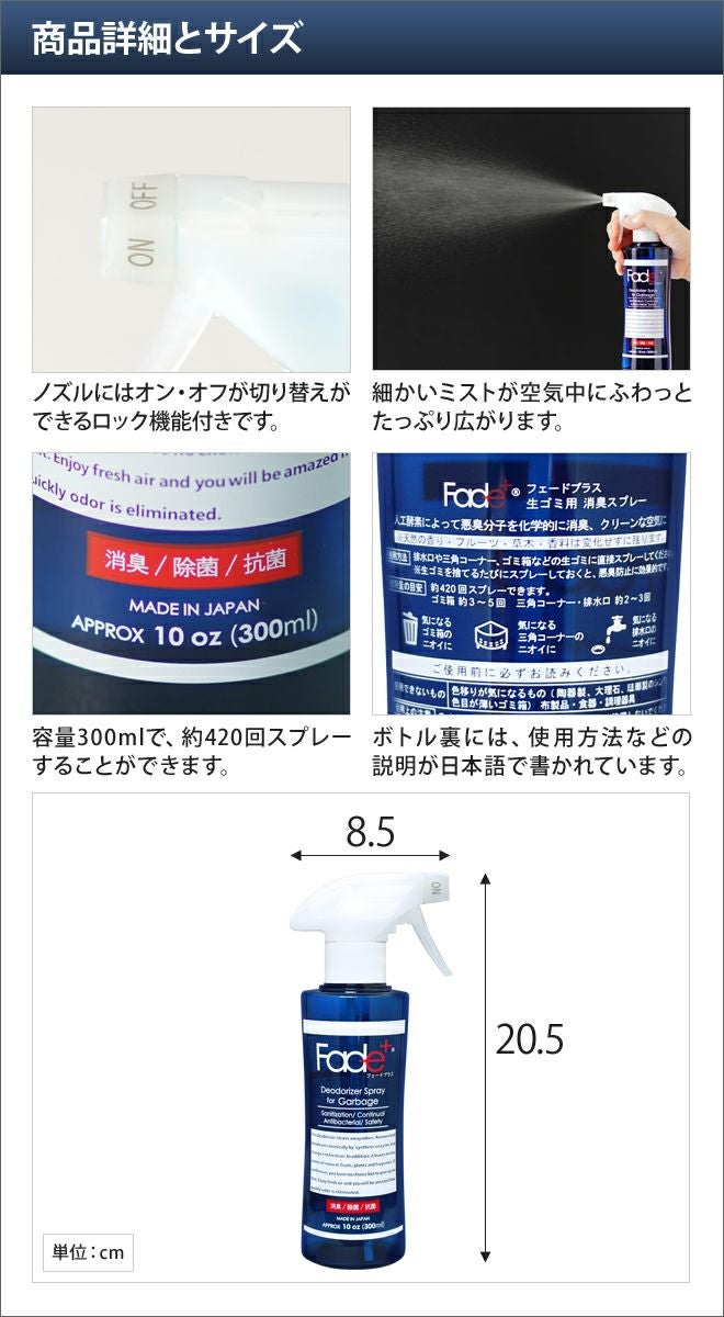 他の画像を見る 消臭スプレー/消臭剤/除菌スプレー/フェードプラス/生ゴミ用/Fade+/300ml/除菌/抗菌/無香/無臭/ノンアルコール/99%/台所/キッチン/生ゴミ/排水口/三角コーナー/ニオイ/臭い/悪臭/日本製 Fade+消臭スプレー生ゴミ用 300ml 2本セット 除菌 抗菌 無香 キッチン 生ゴミ 三角コーナー 排水口 ニオイ 日本製 消臭剤 フェードプラス 当店特別価格 ¥ 4,620 税込 在庫切れ 詳細を見る お気に入りに登録する