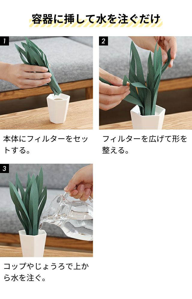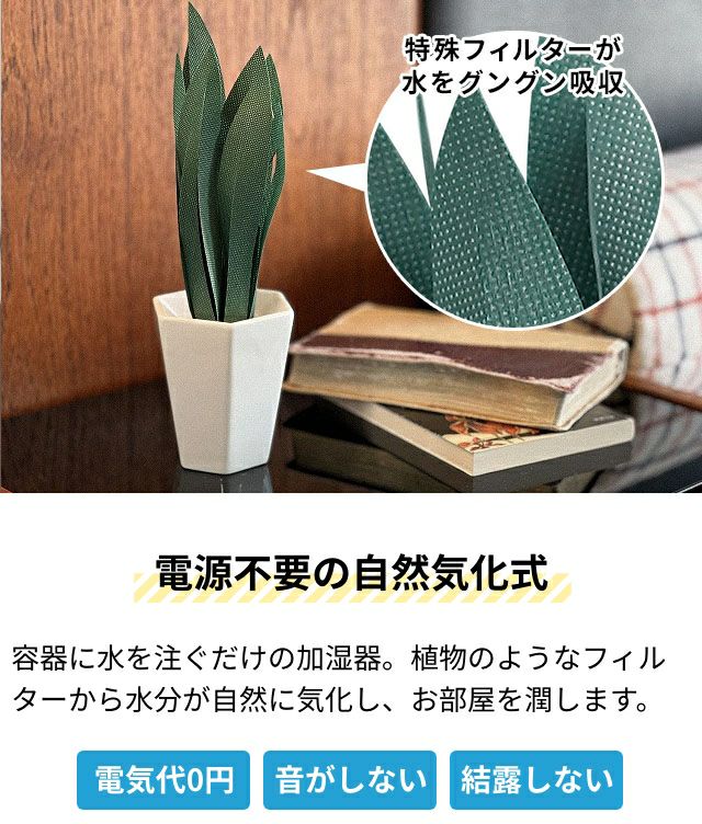 他の画像を見る 電源も電気代も一切必要のない、まるで観葉植物のようなエコ加湿器。お水さえあればどこでも使えます。音も光も出さない自然気化式だから、睡眠を妨げません。 ミクニ エコ 加湿器 ミスティプランツ サンスベリア ペーパー加湿器 卓上 デスク 小型 小さい お手入れ簡単 ペットボトル かわいい おしゃれ 電源不要 電気 使わない コードレス 部屋 寝室 リビング オフィス 持ち運び 気化式 ベッドサイド 日本製 当店特別価格 ¥ 2,280 税込 詳細を見る お気に入りに登録する