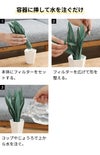 観葉植物のように、容器にお水を注ぐだけのエコな加湿器。フィルターから水分が自然に気化する「自然気化式」なので、電源も電気代も一切必要ありません。