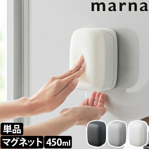 容器そのものがポンプの機能を持つ、「marna マグネットディスペンサー」。やわらかなシリコーン部分を押し込む強さで、液量を自由に調節できます。下向きだから液体ソープを残すことなく、最後まで使いきれるのが魅力。コンパクトなのにたっぷり入る容量450mlで、口が広く詰め替えも簡単です。ころんと丸みを帯びた、親しみのある形状で浴室をおしゃれに見せてくれます。