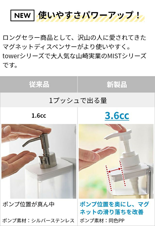 従来品よりも1プッシュがたっぷり出る!ロングセラー商品として沢山の人に愛されてきたマグネットディスペンサーがより使いやすくパワーアップ。 山崎実業 たっぷり洗剤が出るマグネットディスペンサー タワー 単品 magnetic dispenser 1532 1533 1534 1535 1536 1537 ソープディスペンサー シャンプーボトル ソープポンプ 詰め替えボトル tower magnetic dispenser タワーシリーズ