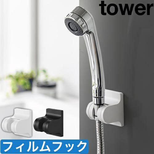 風呂のシャワーホースを引っ掛けるホルダー「tower 角度が調節できるフィルムフックシャワーホルダー」。角度調整が出来て肩や腰などピンポイントに水流を当てられます。体をひねらずに済むのでお年寄りに優しく、子どもの介助にも最適。穴開け不要で、お好みの高さに位置に貼れます。内側のストッパーで、水圧がかかってもズレにくく浴室環境が快適になります。