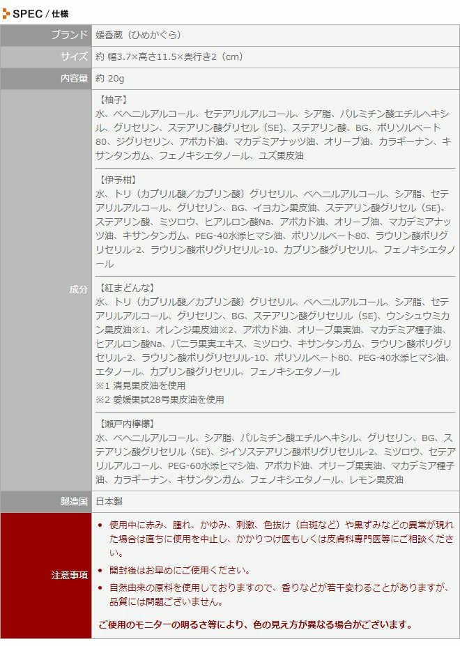 他の画像を見る 愛媛産柑橘の爽やかでやさしい香りのハンドクリーム。植物由来の保湿成分配合 媛香蔵 モイスチャーハンドクリーム 50g 当店特別価格 ¥ 1,650 税込 詳細を見る お気に入りに登録する