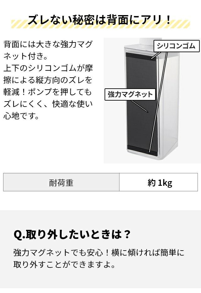 他の画像を見る 従来品よりも1プッシュがたっぷり出る!ロングセラー商品として沢山の人に愛されてきたディスペンサーがより使いやすくパワーアップ。 山崎実業 たっぷり洗剤が出るマグネットディスペンサー ミスト 1544 1545 1546 ソープディスペンサー シャンプーボトル ソープポンプ 詰め替えボトル 容器 液体 浮かせる 壁掛け 磁石 おしゃれ 袋のまま 詰め替えそのまま MIST yamazaki 当店特別価格 ¥ 2,200 税込 詳細を見る お気に入りに登録する