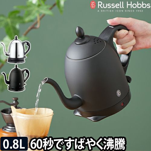 RUSSELL HOBBSのカフェケトルは長年、ほとんど変わらないデザインで愛されているケトル。満水の0.8Lでも約4分で沸騰するので、忙しい朝にもぴったり!先に向かって細くなる注ぎ口で、お茶やカップ麺用だけでなくコーヒードリップにも対応できます。ストッパー付きのハンドルや安定した注ぎを助ける補助部など、細部にもこだわり設計された使い勝手の良いケトルです。