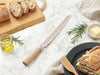 「庖丁工房タダフサ パン切り包丁」は、先端のみ波刃で、その他は直刃という独特な形状が特徴。刃がスッと入り、パンをつぶさずに滑らかに切れるため、パンくずがほとんど出ません。刃には錆びにくく鋭いSLD鋼、柄には腐りにくい抗菌炭化木を使用。サンドイッチやハード系のパンも美しく切れる、パン好きのための日本製包丁です。