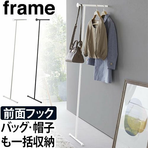 frame スリムコートハンガーは、壁に立てかけるだけで簡単に設置ができるコート掛け。スリムで一人暮らしの玄関やリビングにも圧迫感なく設置できます。明日着る服のセットや来客用などに便利!引っ掛け部が長いので省スペースながら沢山の服を収納できます。