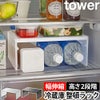 「tower 伸縮冷蔵庫中収納ラック」は、冷蔵庫内の収納力を上げてくれるコの字ラック。置くだけで2段収納ができ、幅伸縮式で冷蔵庫の隙間を無駄なく活用できます。高さは2段階調整が可能で、下段には2Lペットボトルや冷水筒も入ります。2段収納なので作り置きの保存容器も、重ねて収納するより取り出しやすく収納。