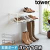 壁面に浮かせて設置できる「tower(タワー) 石こうボード壁対応ウォールシューズラック タワー 2段」。ショートブーツや長靴・ロングブーツの高さに合わせて設置可能。石こうボードピンだから壁の穴が目立ちにくいです。浮かせるから掃除もラクラク!小物をかけるフック付きなのも嬉しい。シンプルなデザインでどんな玄関にもなじんでくれます。