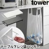 キッチン棚やテーブルの下に簡易ゴミ箱を設置できる「tower テーブル下レジ袋ハンガー」。キッチンに設置して資源ごみを捨てたり、テーブル下に設置してくずかご入れにすると便利です。開口がスライド式で蓋を開口する必要がないので、省スペース。レジ袋や市販のゴミ袋を引っ掛けて使用するので、袋いっぱいにゴミを捨てられて、ゴミの量も一目でわかりやすくなっています。