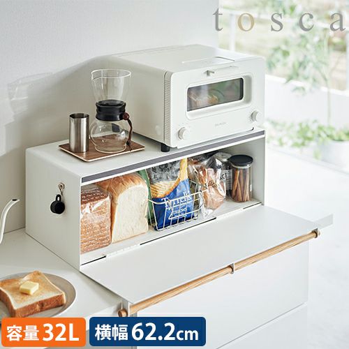 キッチン周りがすっきり片付く「tosca(トスカ) ブレッドケース ワイド」。パンや調味料・お菓子などをまとめて収納できる大容量の32Lワイドサイズ!マグネット付きのドアで簡単に開閉ができ、中身を隠せます。ケースの上はトレーやマグなどの普段使いのアイテムをまとめて置いたり、トースターも置けて空間を有効活用。どんなキッチンにも溶け込むシンプルなデザイン◎