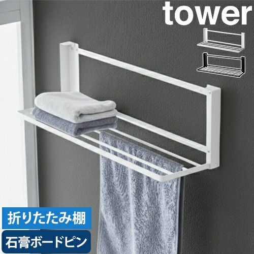 「tower (タワー) ウォール折り畳みバスタオルラック 石こうボード壁対応」、石膏ボードピンで壁面に設置できる折りたたみ式の棚。お風呂上がりにすぐ使いたいバスタオルや着替えの一時置き場が作れます。使わない時は畳んで省スペースに収納できるので、狭い洗面所やランドリールームにオススメ◎スチールフレームにタオルハンガーや室内干しとしても使える便利なラックです。