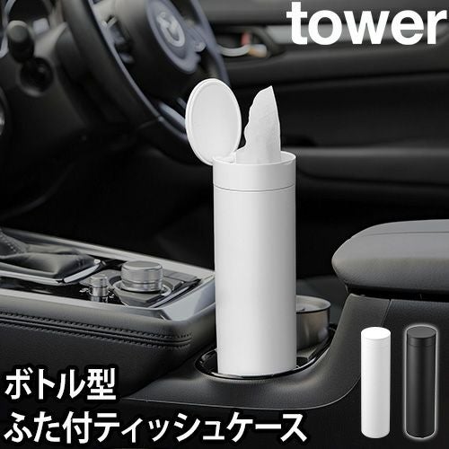 車内のドリンクホルダーやドアポケットにぴったり収まる「tower ボトル型蓋付きティッシュケース」。筒型で上からティッシュを取り出すので、ボックス型に比べて省スペースに設置できます。