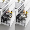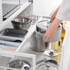 深さがあって全ての空間を活用しにくいシンク下の引き出しに、収納スペースを追加してくれるのが「tower シンク下引き出し幅伸縮スライドラック D30」。ラックを置くことで上段・下段に分けて収納することができ、置き場所に困りがちなフライパンやボウル、バット、計量カップもすっきり収まります。シンプル&スタイリッシュなデザインはどんな空間にもよく溶け込みます。