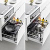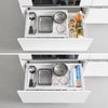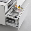 深さがあって全ての空間を活用しにくいシンク下の引き出しに、収納スペースを追加してくれるのが「tower シンク下引き出し幅伸縮スライドラック D40」。ラックを置くことで上段・下段に分けて収納することができ、置き場所に困りがちなフライパンやボウル、バット、計量カップもすっきり収まります。シンプル&スタイリッシュなデザインはどんな空間にもよく溶け込みます。