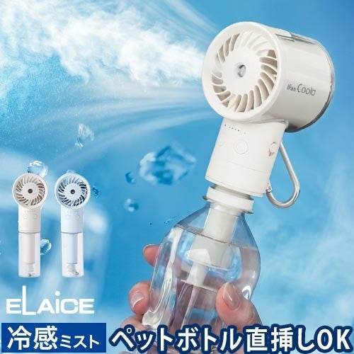 エレスのアイファンクーラは、微細なミストと風の気化熱で涼しさを届ける携帯扇風機です。付属の給水ボトルのほか、市販のペットボトルを取り付けて長時間ミストを楽しむことも可能。カラビナ付きでカバンにサッと掛けられ、通勤通学やキャンプなど、真夏日に大活躍。持ち運べる冷風扇として、ギフトにもおすすめです。