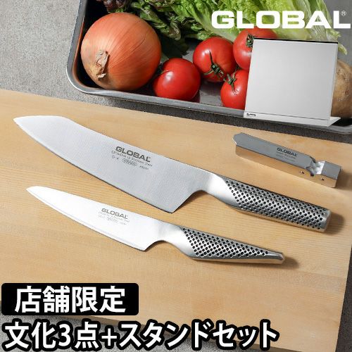 GLOBAL (グローバル) 文化3点・ナイフスタンドセット (文化包丁18cm+ペティナイフ+スピードシャープナー+ナイフスタンド)