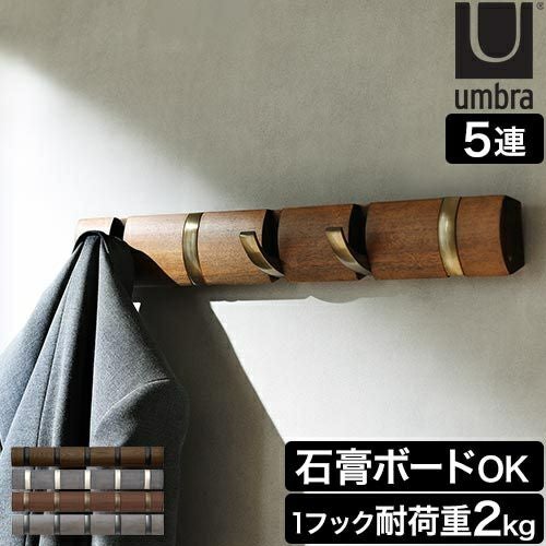 お好きな高さに壁面設置できるコートハンガー、「umbra フリップフック 5連」。ジャケットやバッグを掛けるのはもちろん、よく使う帽子や傘を掛けるのにもぴったり。1フックにつき耐荷重2kgのしっかりとした作りで、冬物コートも安心して掛けられます。フックは折りたたみ式なので、使わないときはすっきりとした佇まい。玄関や廊下をさりげなくおしゃれに演出してくれます。