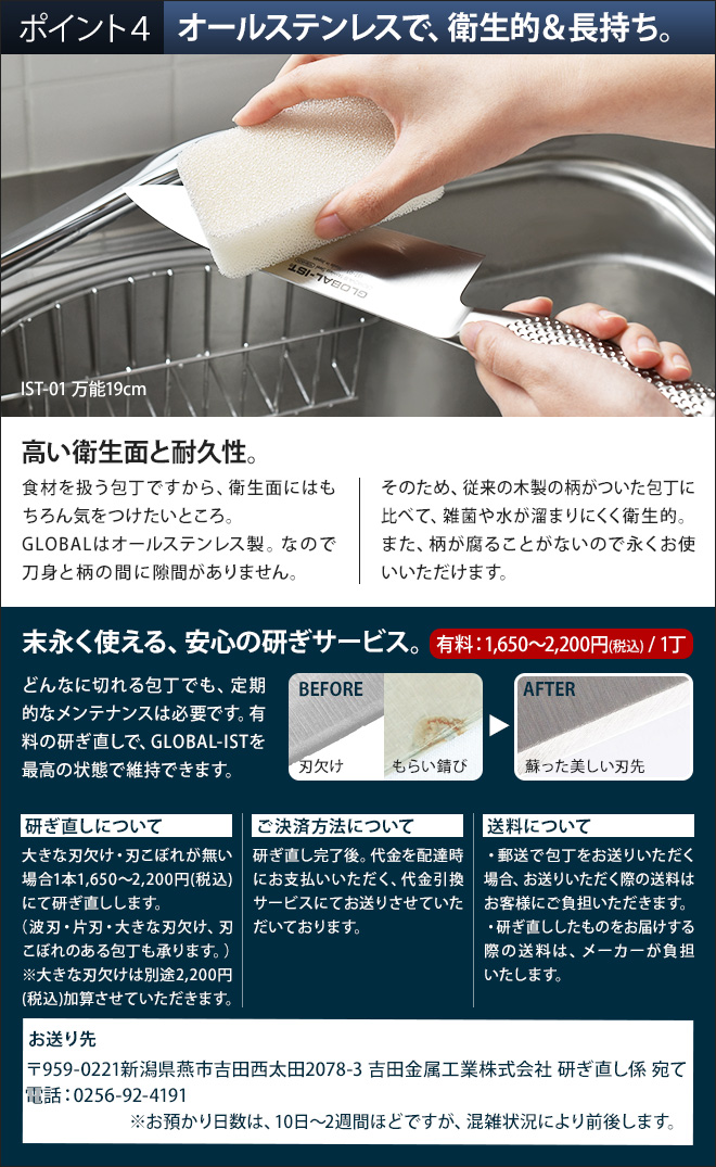 料理人は「切れ味」は勿論、衛生面も重要視します。一般的な包丁は柄が木製のため、柄に刀身を差し込んで成形します。そのため刀身と柄の接続部に水が入り、雑菌の温床に。また水の浸入により柄が腐り、刀身が抜け落ちるなんてことも。