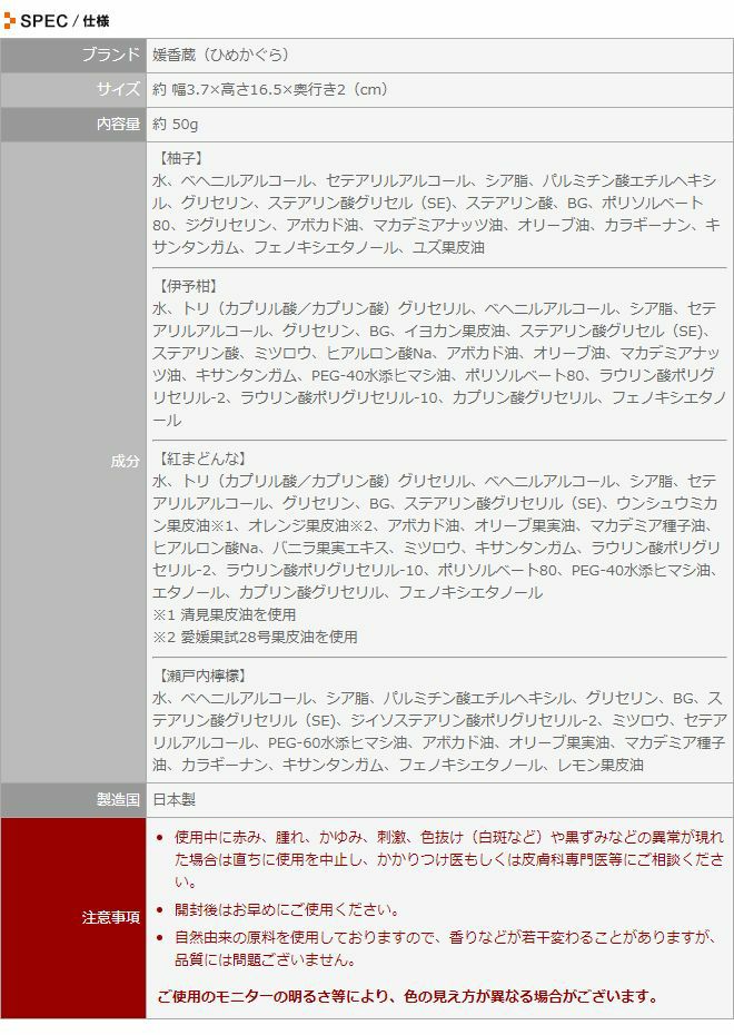 他の画像を見る 愛媛産柑橘の爽やかでやさしい香りのハンドクリーム。植物由来の保湿成分配合 媛香蔵 モイスチャーハンドクリーム 50g 当店特別価格 ¥ 1,650 税込 詳細を見る お気に入りに登録する