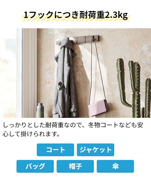 他の画像を見る お好きな高さに壁面設置できるコートハンガー。1フックにつき耐荷重2kgのしっかりとした作り。フックは折りたたみ式なので、使わないときはすっきりとした佇まいです。 アンブラ 壁掛けフック フリップフック 5連 コートハンガー ハンガーフック コート掛け 折りたたみフック ウォールフック ハンガーラック 洋服掛け おしゃれ 壁付け シンプル 省スペース 木製 石膏ボード 折り畳み式 玄関 umbra FLIP 5 WALL HOOK 当店特別価格 ¥ 4,980 税込 詳細を見る お気に入りに登録する