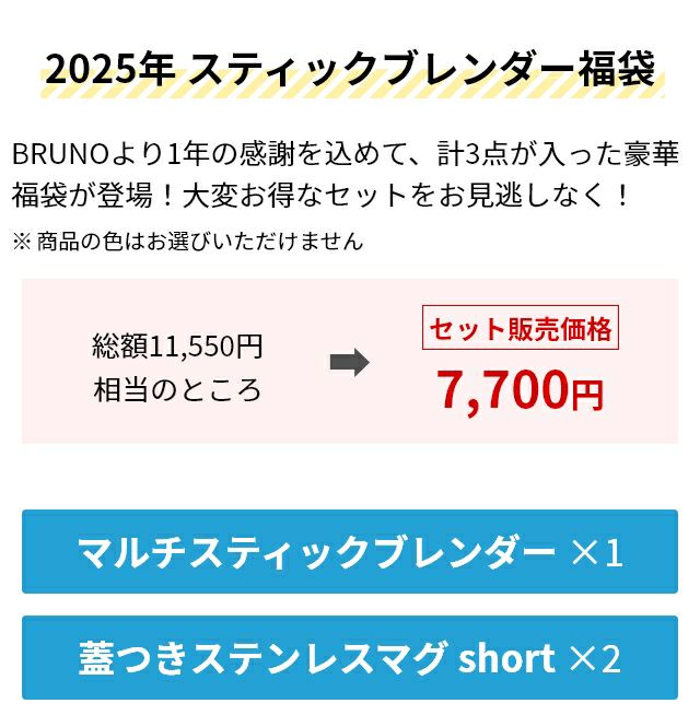 他の画像を見る BRUNOの豪華でお得な福袋!マルチスティックブレンダー、蓋つきステンレスマグ short2点の計3点入り。大変お得なセットをお見逃しなく! ブルーノ 福袋 2025年 マルチスティックブレンダー福袋 BOE034 BHK262 ハンドブレンダー ハンディブレンダー フードプロセッサー ハッピーバッグ ラッキーバッグ お楽しみ袋 お得 離乳食 家電 氷 北欧 砕ける 中身が見える 砕く キッチン家電 BRUNO 当店特別価格 ¥ 7,700 税込 在庫切れ 詳細を見る お気に入りに登録する