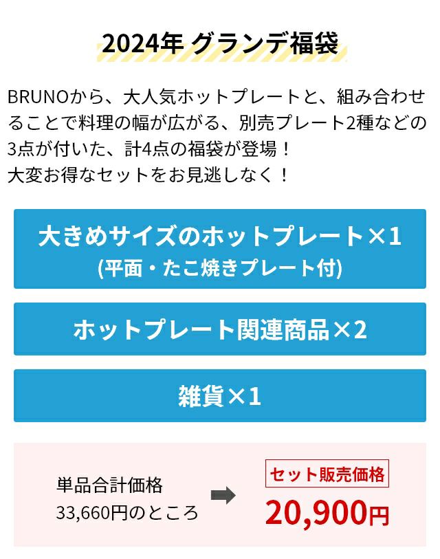 他の画像を見る BRUNOより大人気ホットプレートと関連商品2点、雑貨1点のお得な福袋が登場!ホットプレートは家族で楽しめる大きめサイズで、平面プレート・たこ焼きプレートを標準装備! ブルーノ 2024年 グランデ福袋 ホットプレート セット 家電 おしゃれ キッチン 大型 たこ焼き 温度調節 家族 5人 4人 四角 大きい パーティー 子供 洗いやすい かわいい 平面プレート 卓上 焼肉 アヒージョ 餃子 パエリア パンケーキ BRUNO 当店特別価格 ¥ 20,900 税込 在庫切れ 詳細を見る お気に入りに登録する