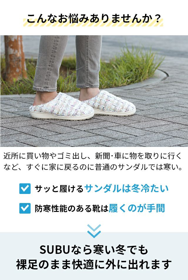 他の画像を見る 寒い時期、ふと出掛ける時に素足で履ける新感覚の秋冬サンダル。モコモコ感を残したツイード素材のアッパーと、内側の起毛素材が足全体にフィットし、足を温かく包みます。 【10%引き】【正規販売店/新作】subu TWEED サンダル ツイード 通販 スリッパ ダウンスリッパ スブ ダウンサンダル レディース スリッポン 外履き 内履き おしゃれ シンプル ルームシューズ 室内履き オフィス サボサンダル キャンプ アウトドア 定価 ¥ 8,580 のところ 当店特別価格 ¥ 7,722 税込 在庫切れ 詳細を見る お気に入りに登録する