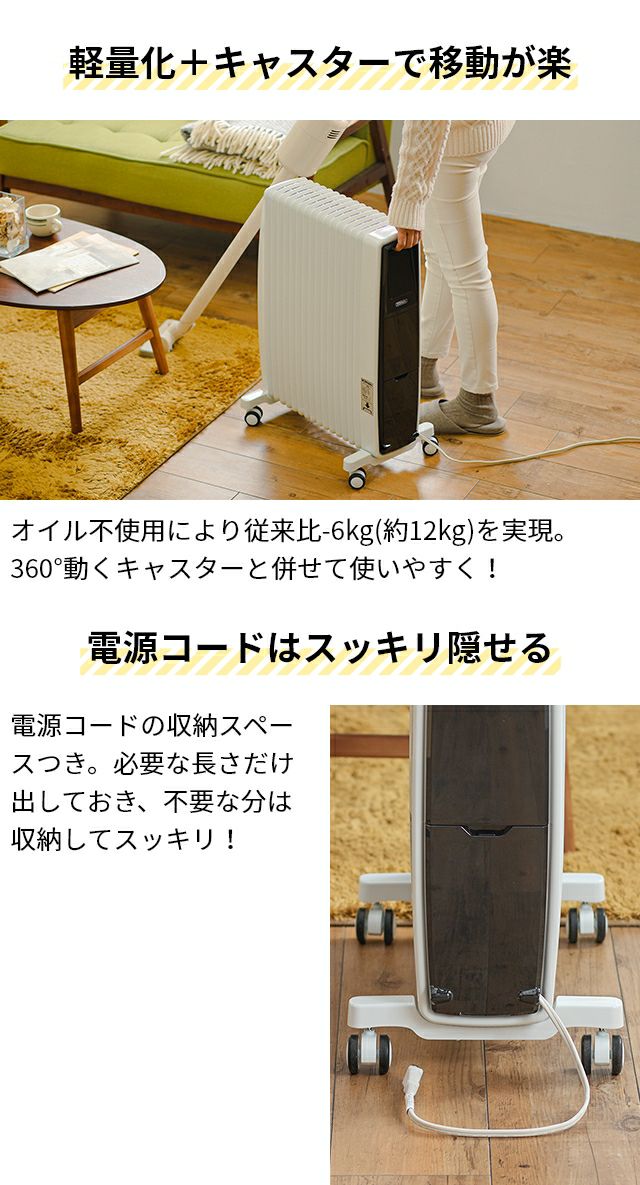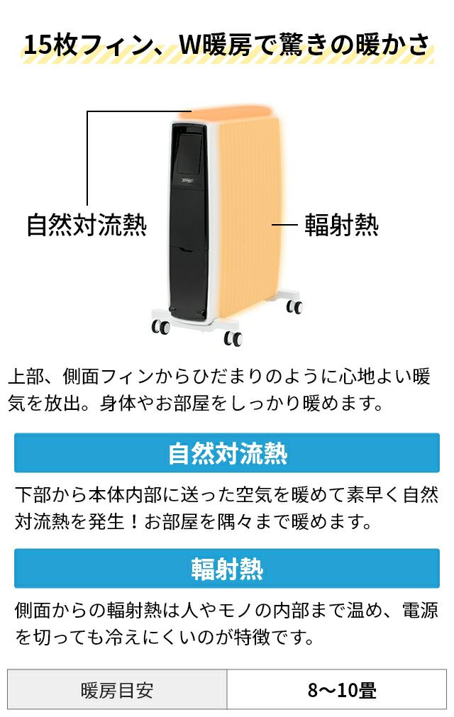 他の画像を見る 速暖・軽量のオイルフリーヒーターは自然対流熱と輻射熱で最大10畳に対応!空気を汚さず乾燥しにくく、約7.6dBと超静音。省エネに優れ、オン/オフタイマー対応です。 ディンプレックス オイルフリーヒーター エボラッド オイルフリーヒーター B05 EVR12ECOMBA1 オイルヒーター オイルレスヒーター 暖房 速暖 即暖 暖かい 静音 省エネ 1200W キャスター 寝室 リビング 10畳 Dimplex EVORAD 当店特別価格 ¥ 54,780 税込 在庫切れ 詳細を見る お気に入りに登録する