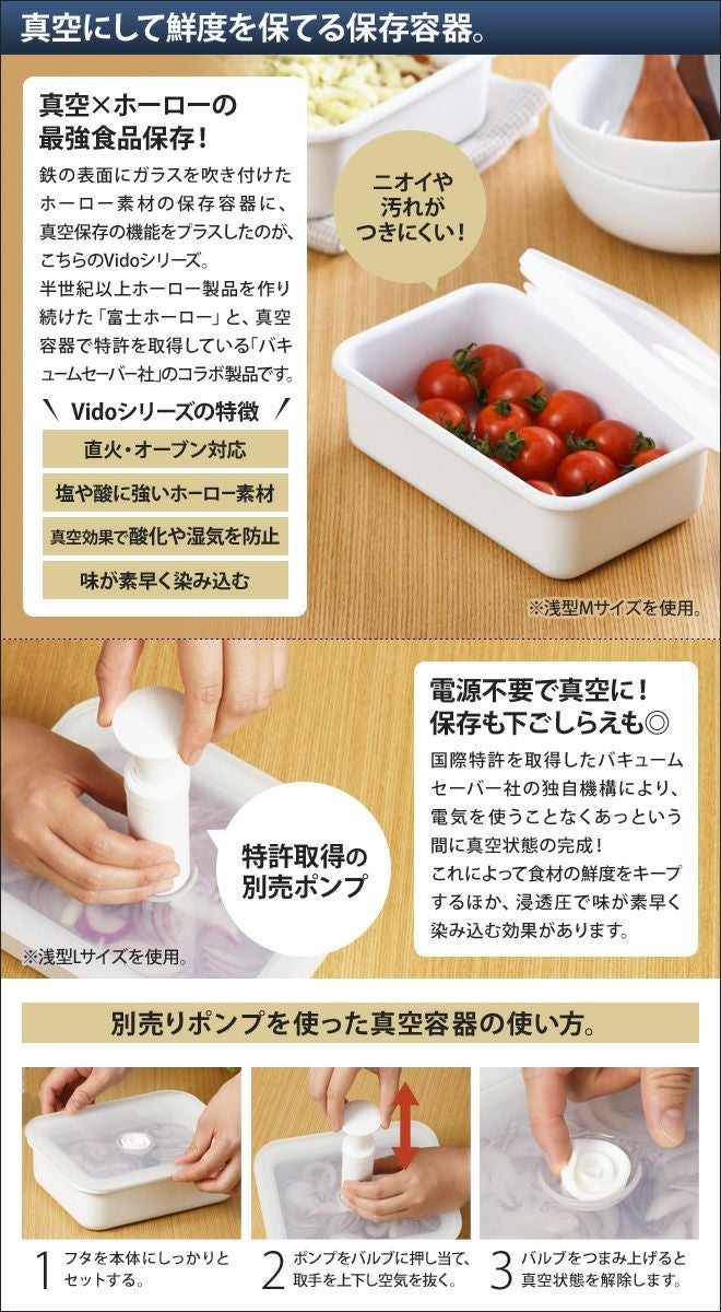 他の画像を見る ホーロー製の保存容器は、作り置きや食品保存の強い味方!別売りポンプで真空にすれば、酸化や湿気を防ぎ、より強固な密閉容器になります。 真空ホーロー容器 Vidoシリーズ 深型角容器 Lサイズ 当店特別価格 ¥ 3,300 税込 在庫切れ 詳細を見る お気に入りに登録する
