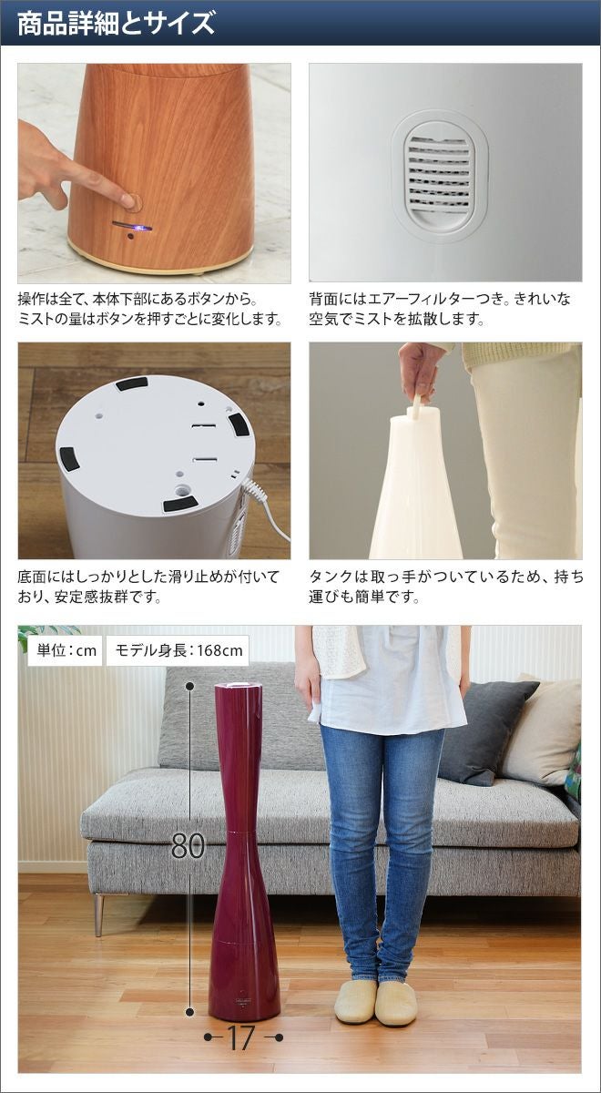 他の画像を見る 高さ80cmから降り注ぐミストはお部屋の高いところから下まで効率よく加湿します。リモコン付き、アロマ対応と多機能でインテリアにもなる美しさが魅力です。 超音波式アロマ加湿器 サブリエ ウッド 当店特別価格 ¥ 14,080 税込 在庫切れ 詳細を見る お気に入りに登録する