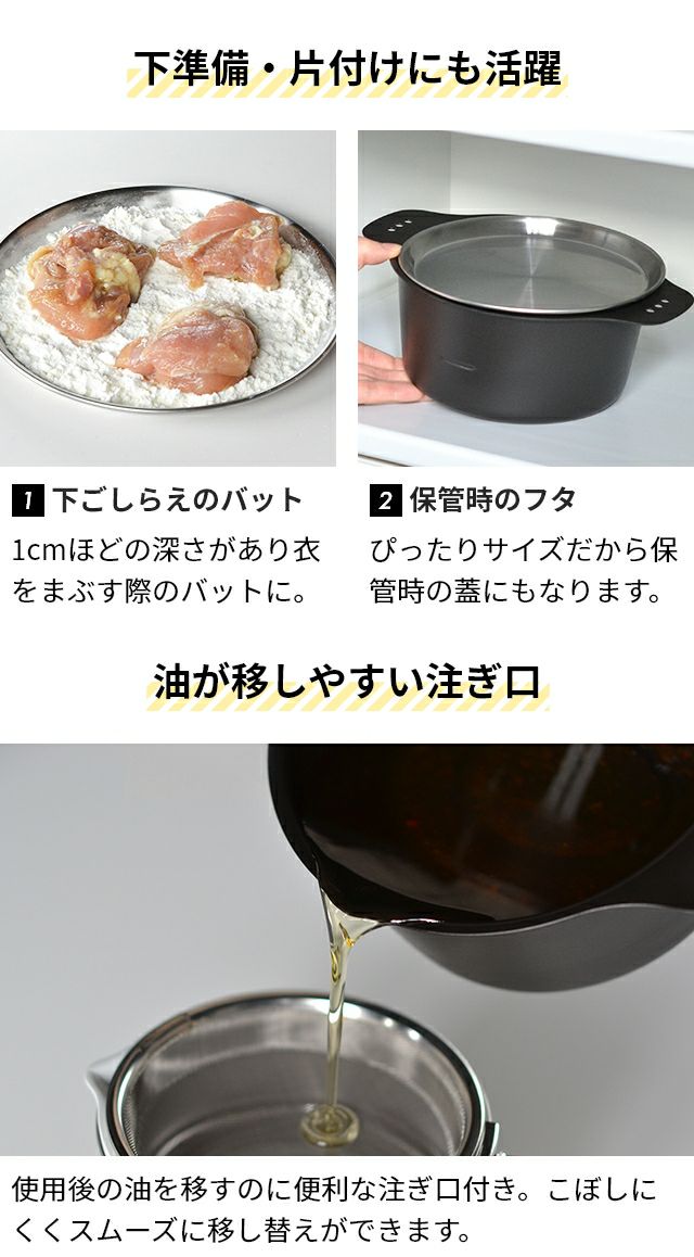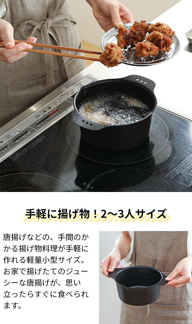 他の画像を見る お家で揚げ物が簡単に作れる揚げ鍋。コンパクトサイズで2~3人分の揚げたてが作れます。小さい鉄鍋だから少量の油で済み、温度が一定に保ててカラッと美味しい仕上がり! ビーワースセレクション 揚げ鍋 から揚げアゲアゲ鍋 天ぷら鍋 鉄なべ 鉄鍋 揚げ物鍋 両手鍋 一人暮らし ih対応 小さい 軽い 少ない油 日本製 コンパクト ミニ 小型 おしゃれ 少量 ihクッキングヒーター 燕三条 弁当 フタ付 鉄 bwsSELECTION 当店特別価格 ¥ 3,850 税込 詳細を見る お気に入りに登録する