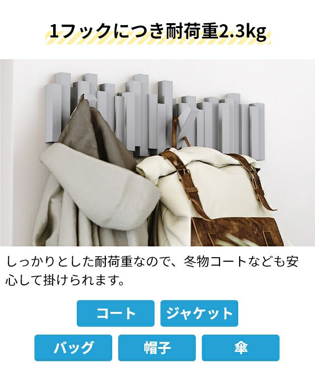 他の画像を見る お好きな高さに壁面設置できるコートハンガー。1フックにつき耐荷重2.3kgのしっかりとした作り。フックは折りたたみ式で、使わないときはオブジェのような佇まいです。 アンブラ 壁掛けフック スティックス マルチフック コートハンガー ハンガーフック コート掛け 折りたたみフック ウォールフック ハンガーラック 洋服掛け おしゃれ 壁付け 省スペース 石膏ボード 折り畳み式 玄関 umbra sticks multi hook 当店特別価格 ¥ 4,500 税込 詳細を見る お気に入りに登録する