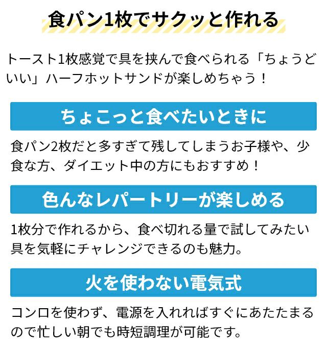 他の画像を見る 一枚の食パンを折りたたんで作るハーフホットサンドができる電気式ホットサンドメーカー。プレート交換が出来てワッフルも作ることが出来ます。 トフィー 【選べる豪華特典】 ホットサンドメーカー ハーフホットサンドメーカー プレート交換式 K-HS5 ワッフルメーカー 電気 餅 耳まで 着脱式 シングル ホットケーキミックス 圧着 ダイエット ハーフ キャンプ 1枚 洗える 一人暮らし フチ圧着 深め おすすめ Toffy 当店特別価格 ¥ 9,900 税込 詳細を見る お気に入りに登録する
